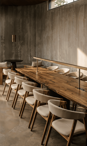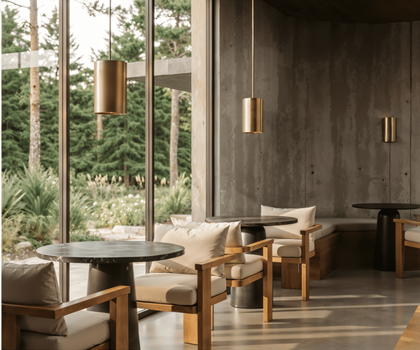 室內延續外部的自然語彙,採用原始材料、沈穩色階與大量自然光作為主題。清水模牆面、金屬量體、中性色系地坪與溫潤木質座椅,構成一個極簡但具有層次的空間氛圍。中央下沉式枯山水引光入室,將外部乾景透過空間操作轉化為室內核心景觀,使使用者在室內也能感受戶外的空氣流動。